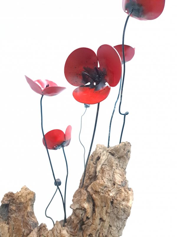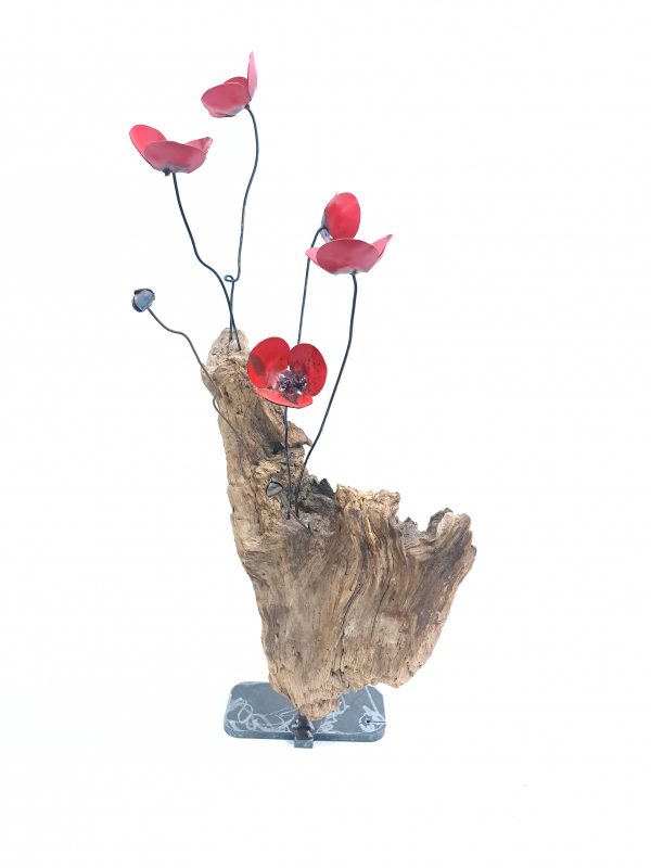 La base de madera de chopo le confiere un aspecto natural y elegante. En el centro de esta obra, encontrarás  hermosas amapolas rojas, cada una de ellas meticulosamente elaborada en chapa de acero, pintada y barnizada para uso en interiores.