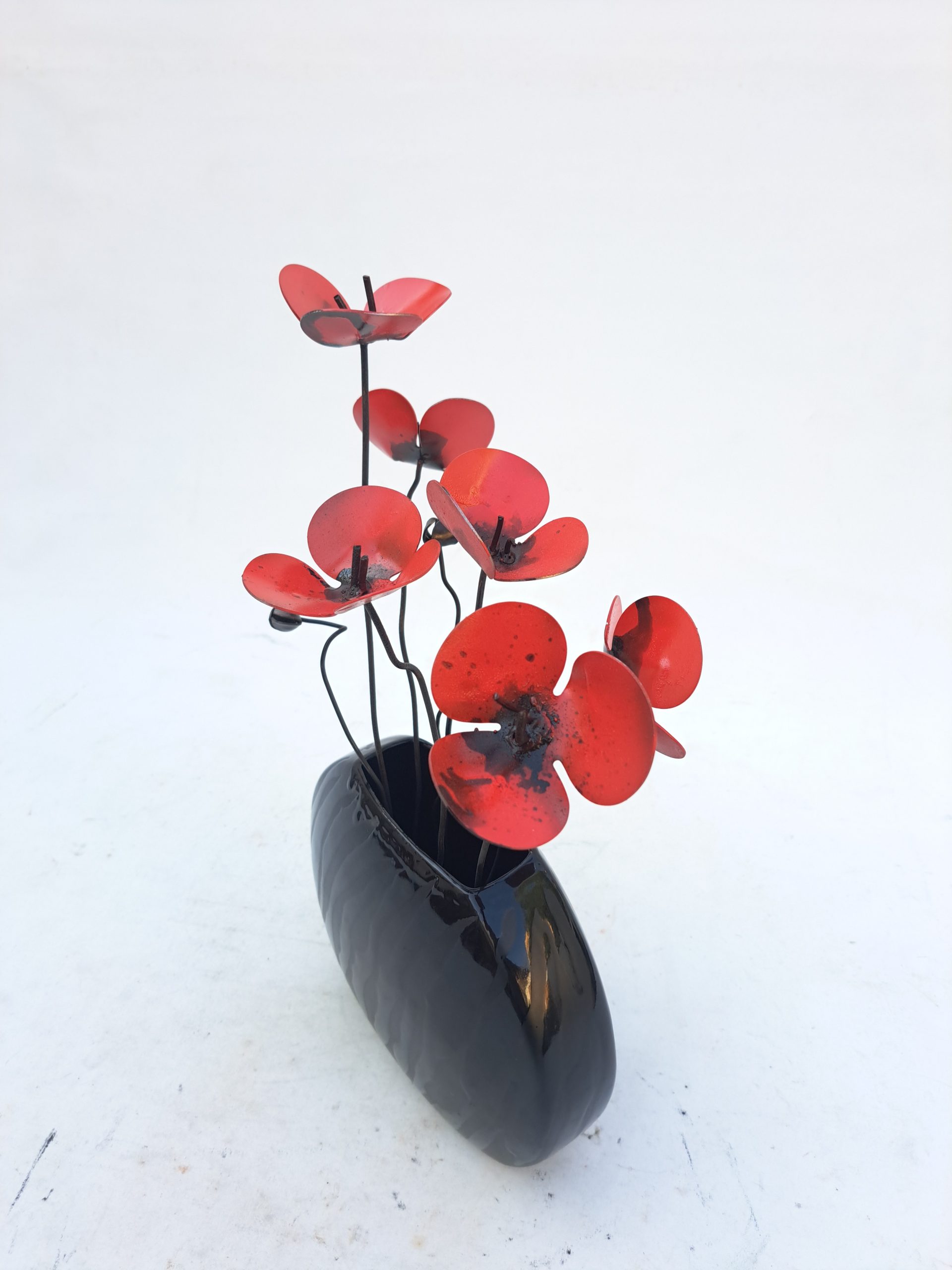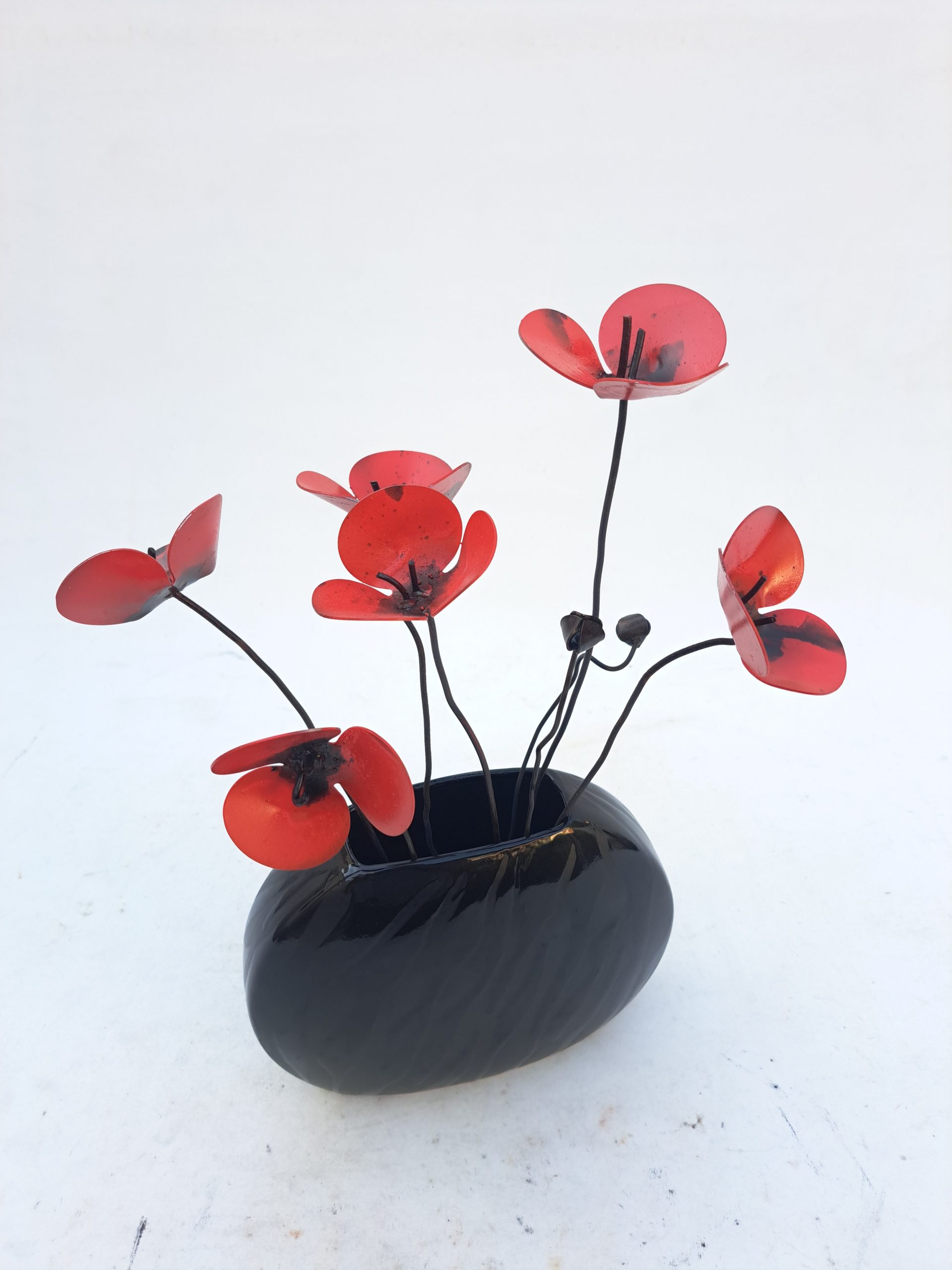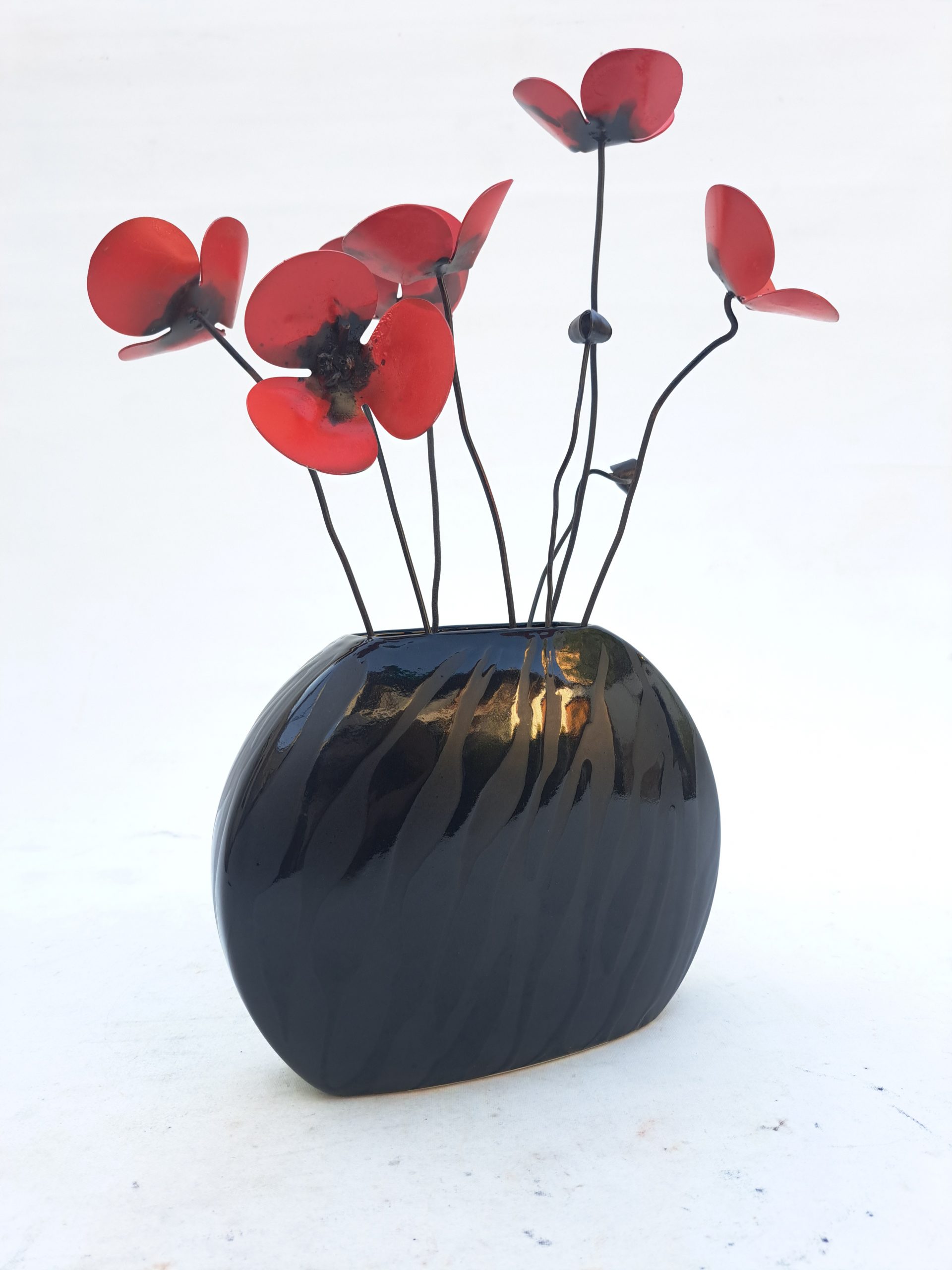 Pieza decorativa con amapolas de metal y jarrón de cerámica