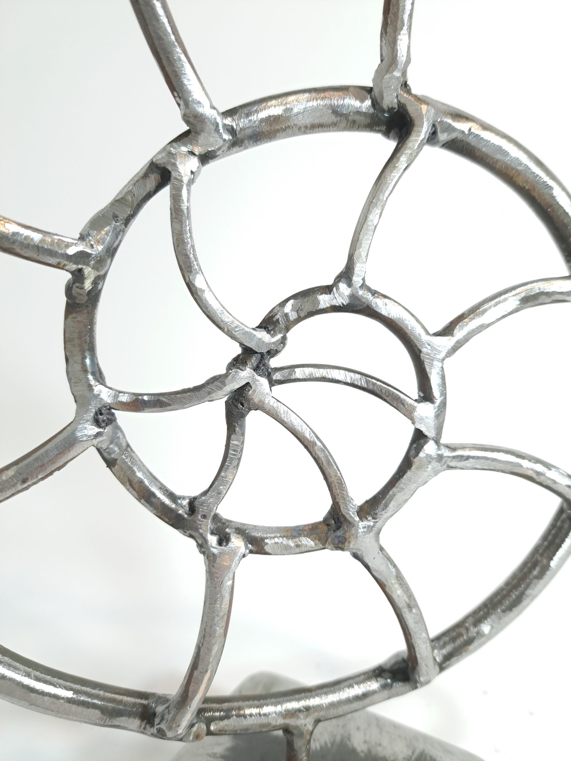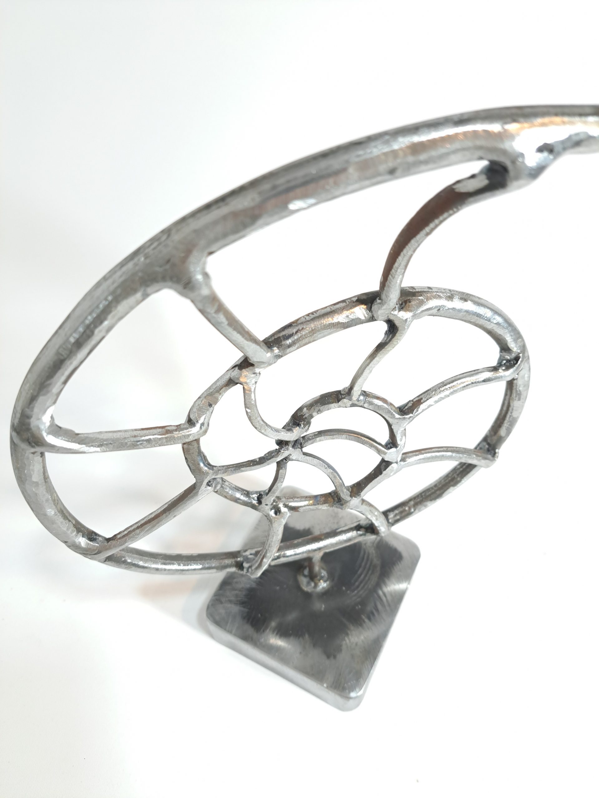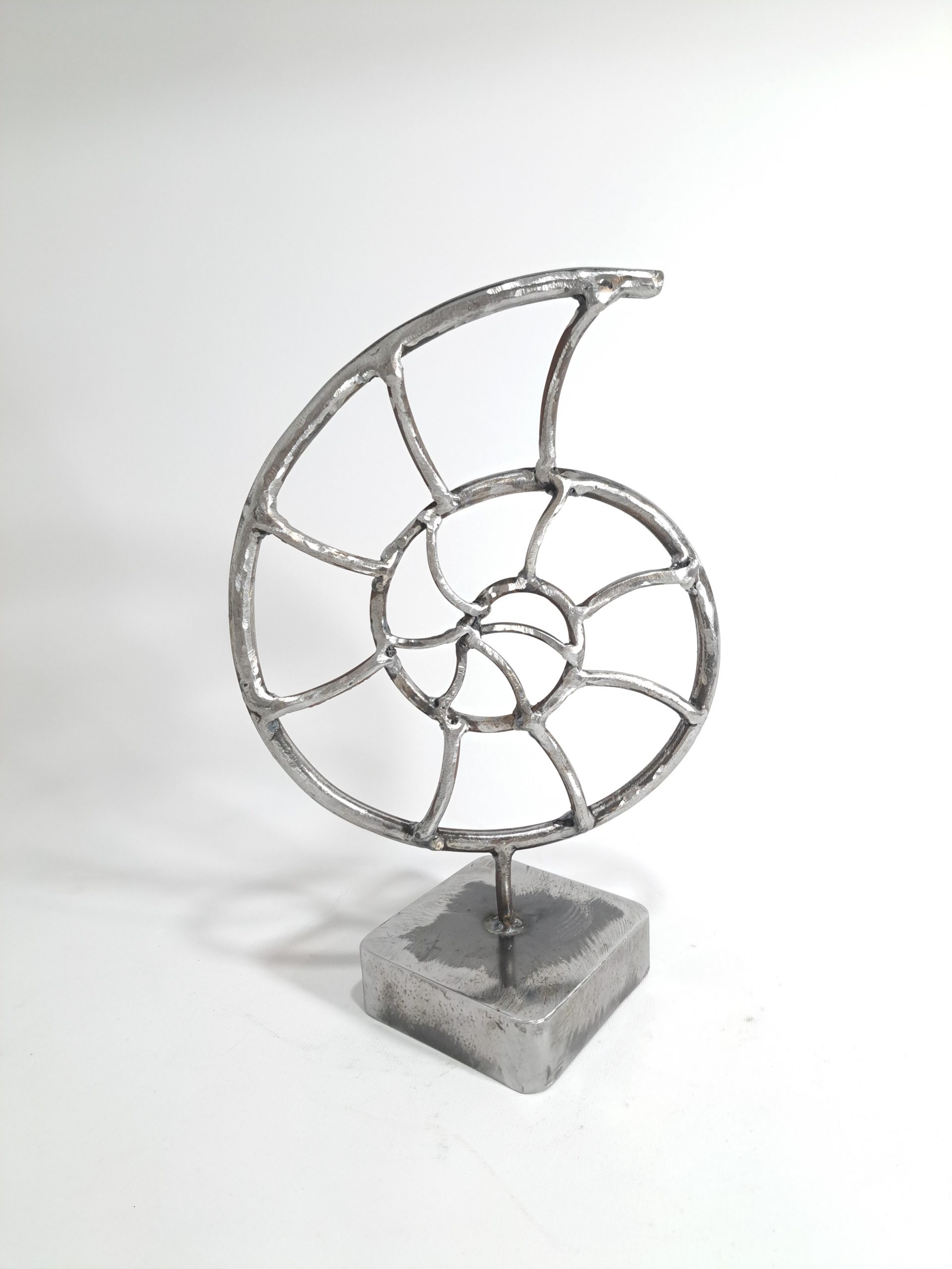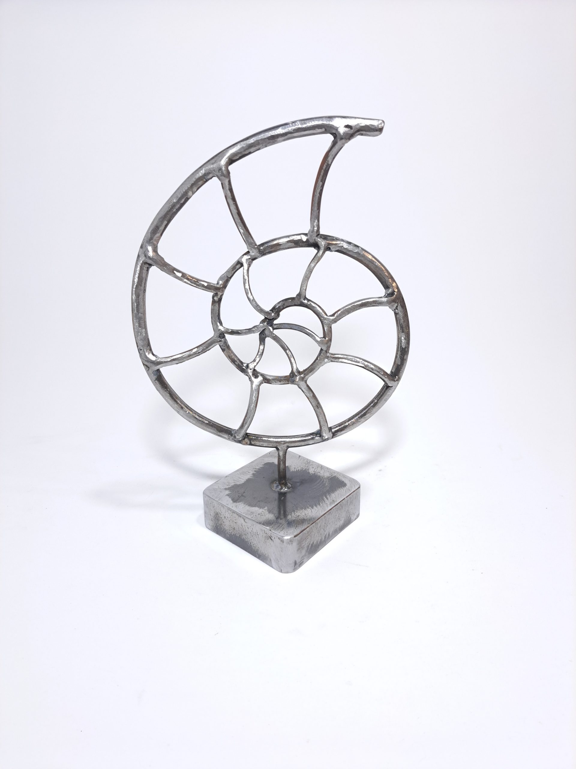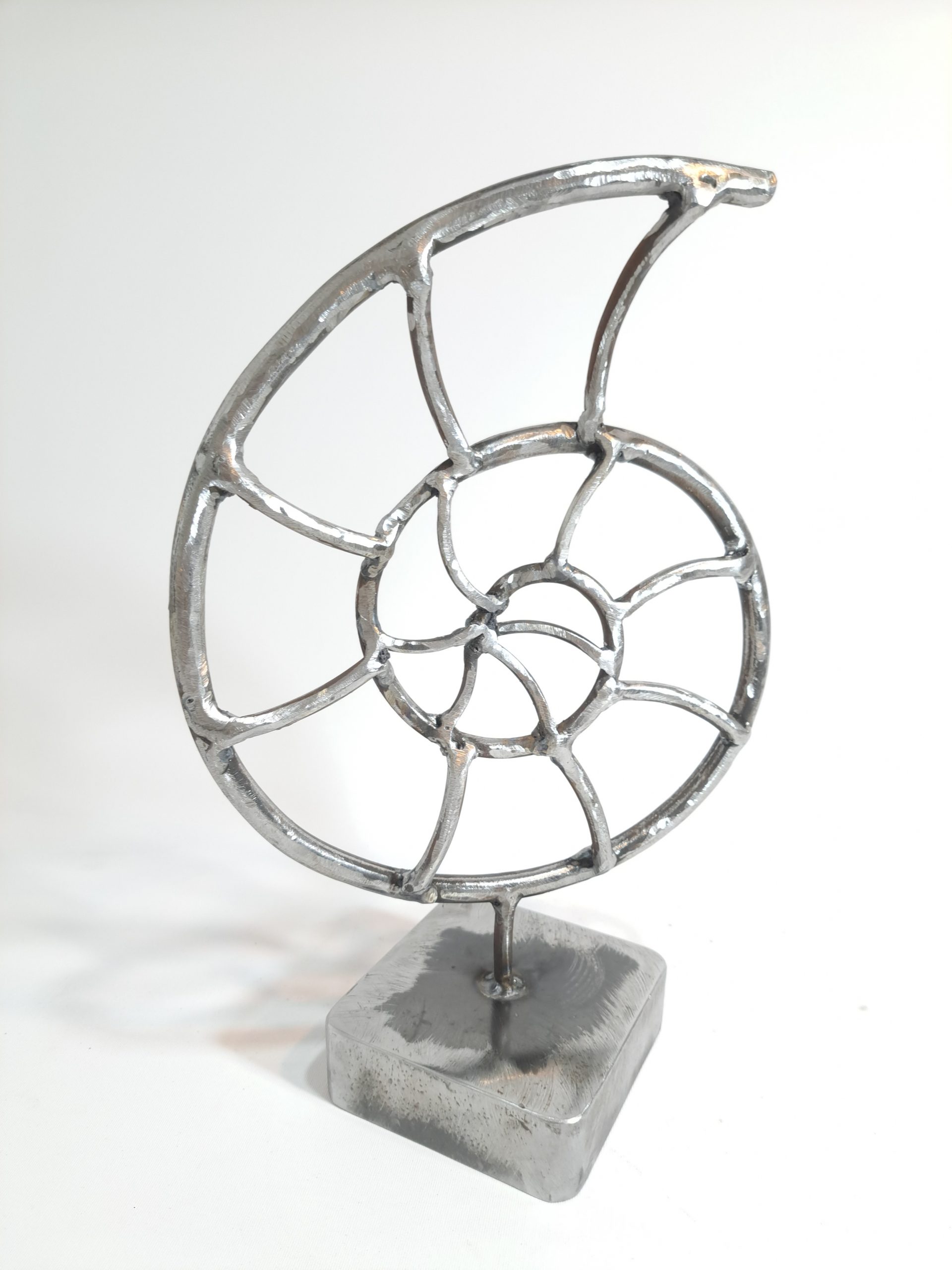 Es una escultura hecha de metal con acabados pulidos dejando el material brillante. Hacer un Amonite ha sido un gran reto, así que si estáis pensando en una pieza única y sorprendente, cuéntanos tu idea y déjanos el resto.