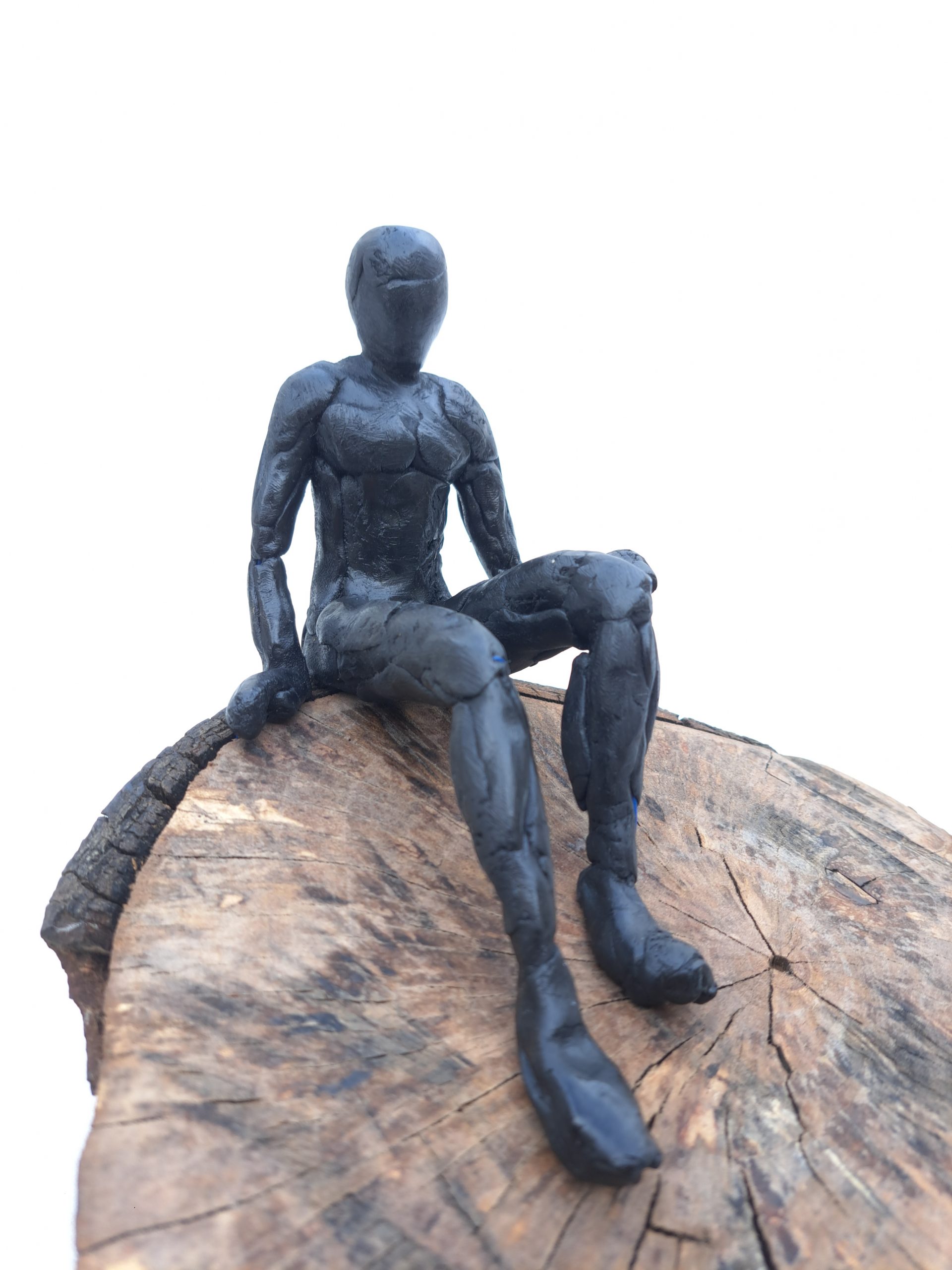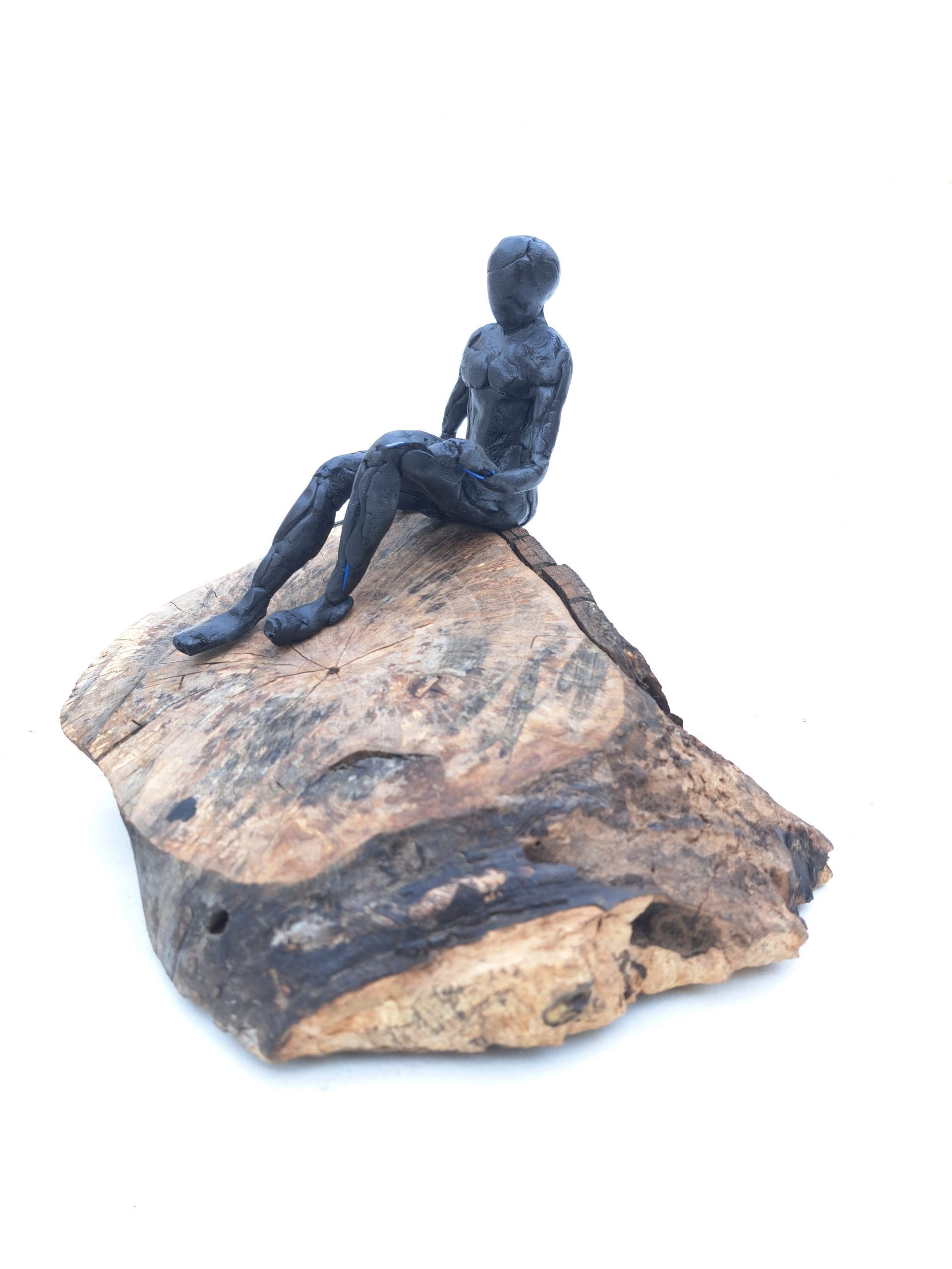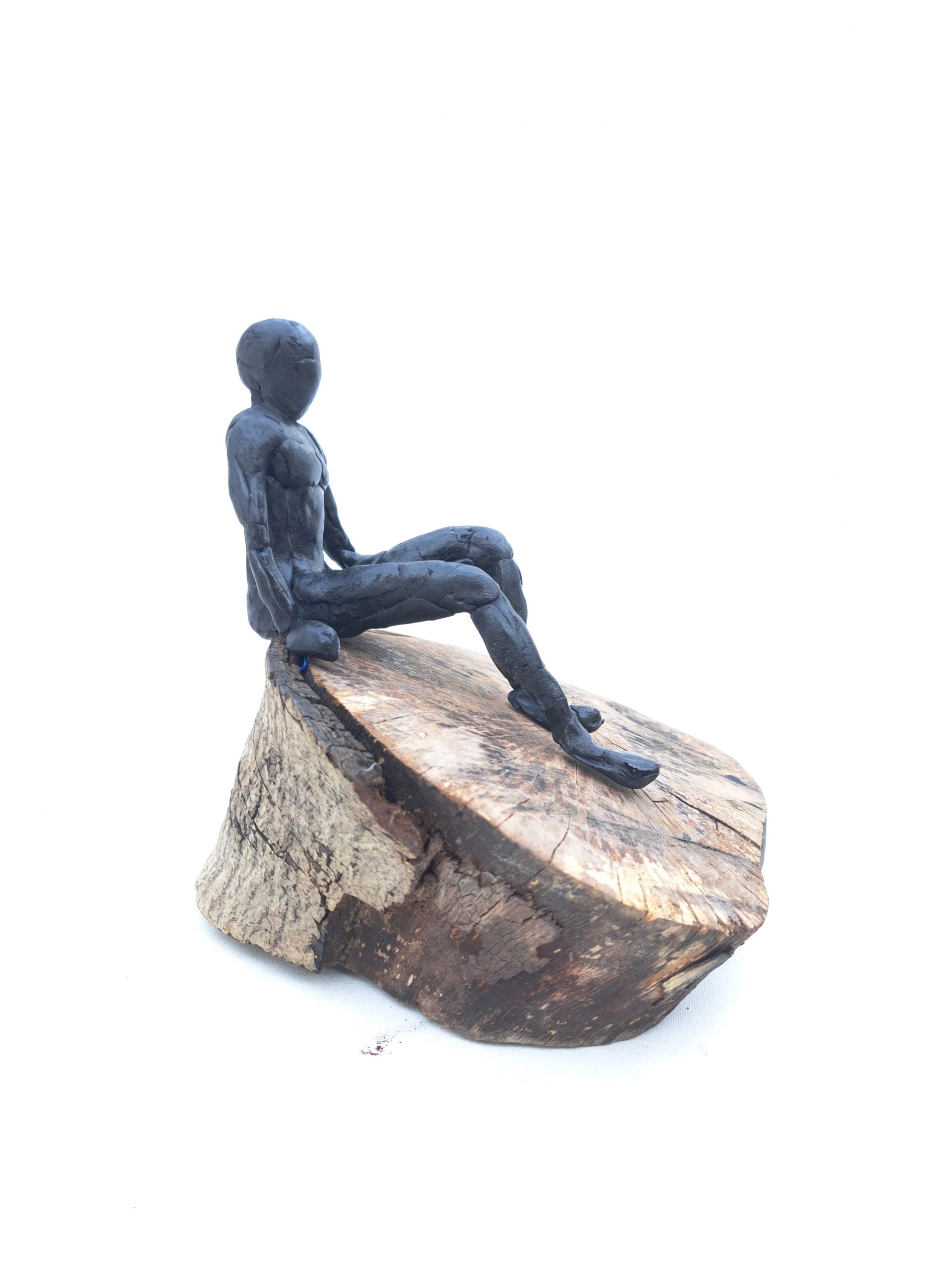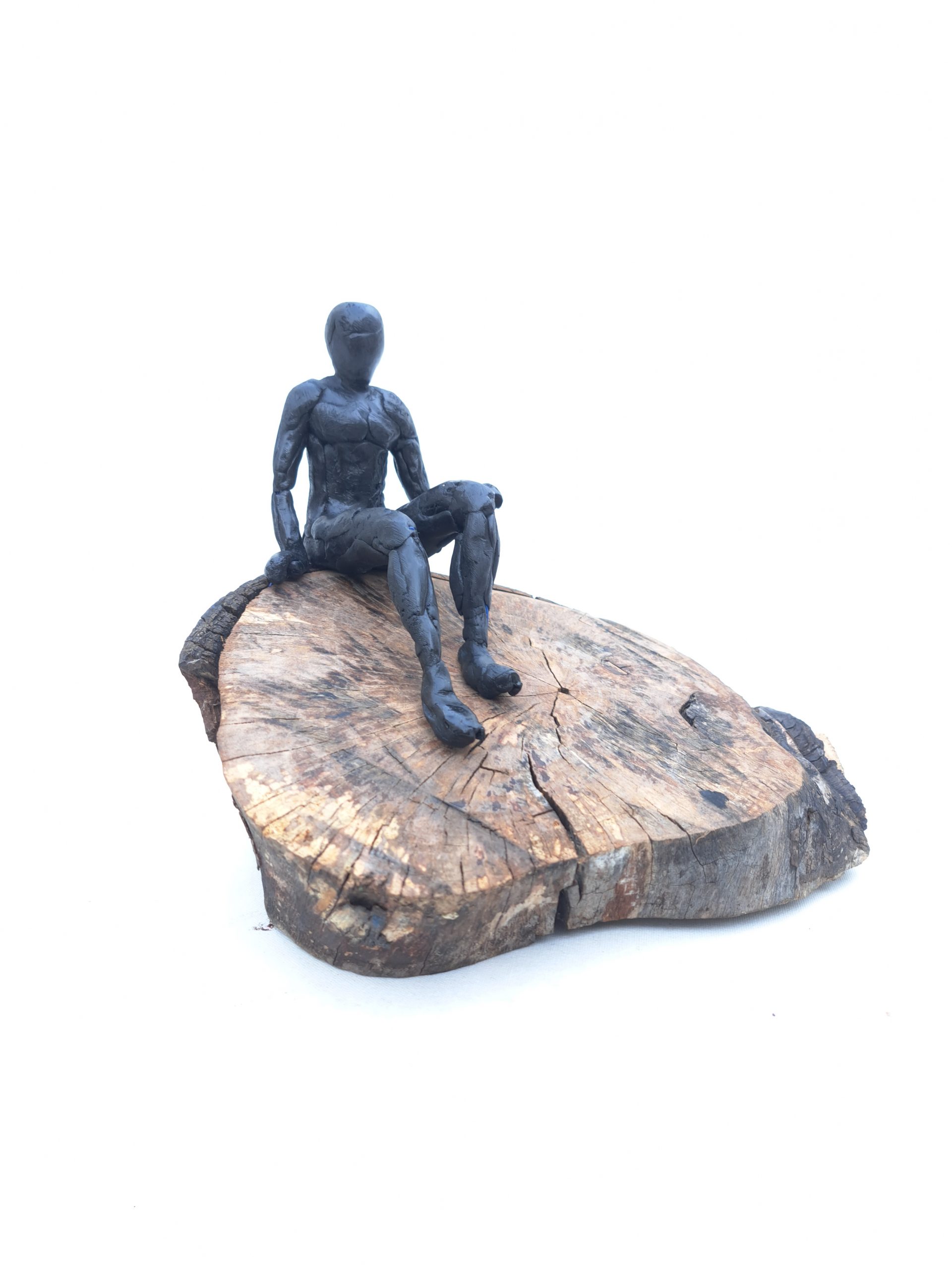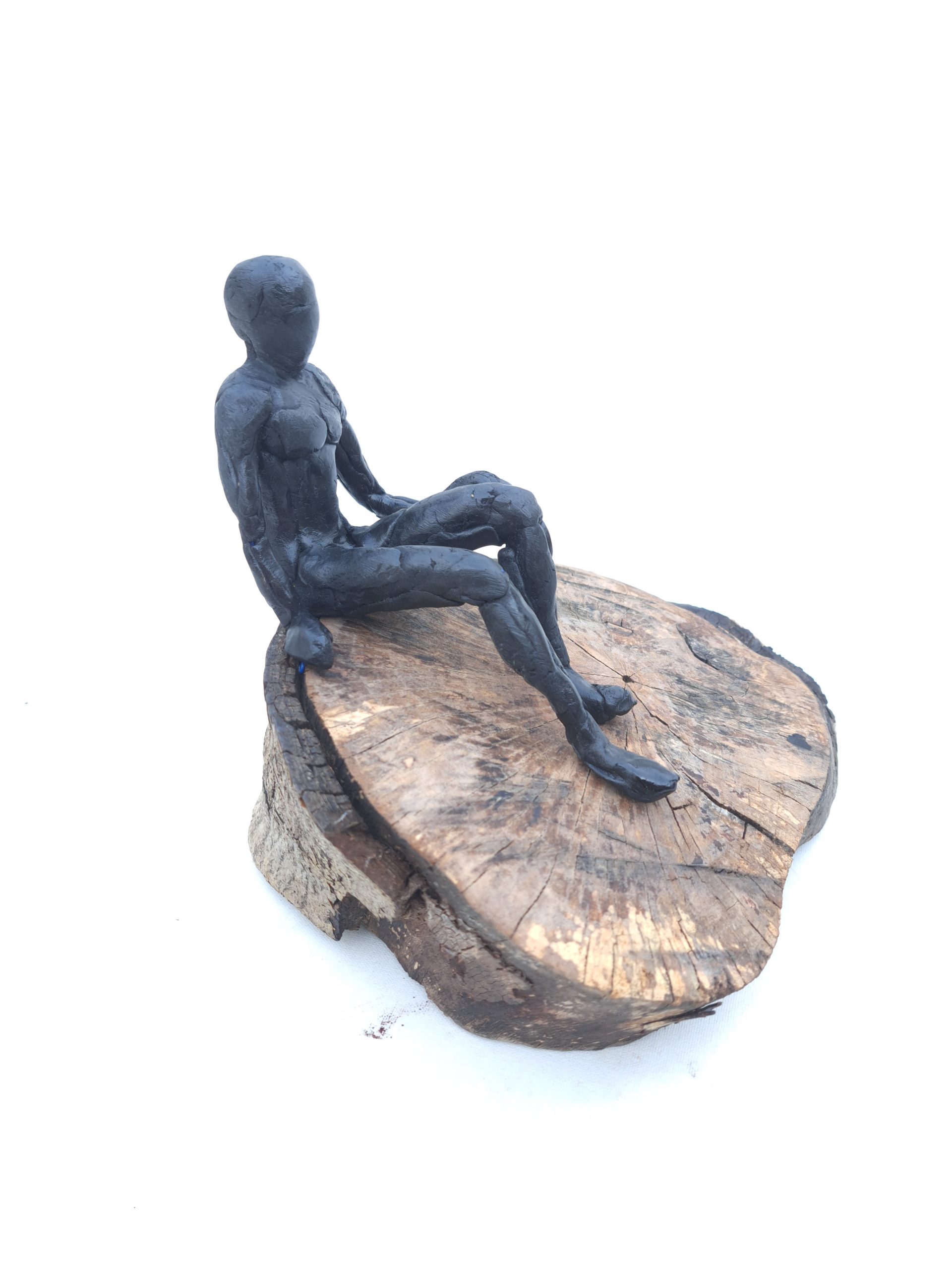 Se trata de una escultura en acero reciclado, modelada en resina epoxi. Reciclamos todo tipo de objetos, la base es un tocón de madera tratado.